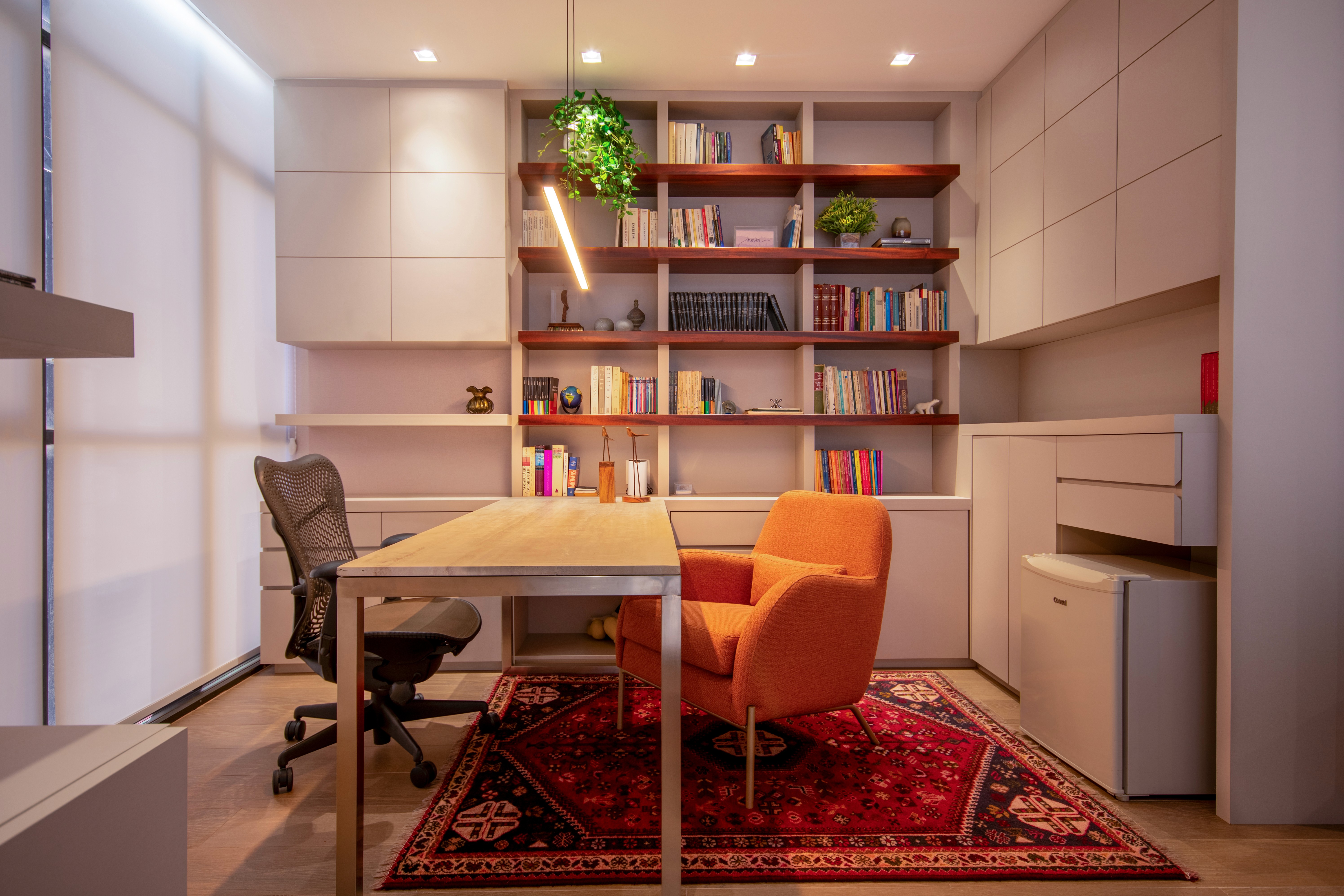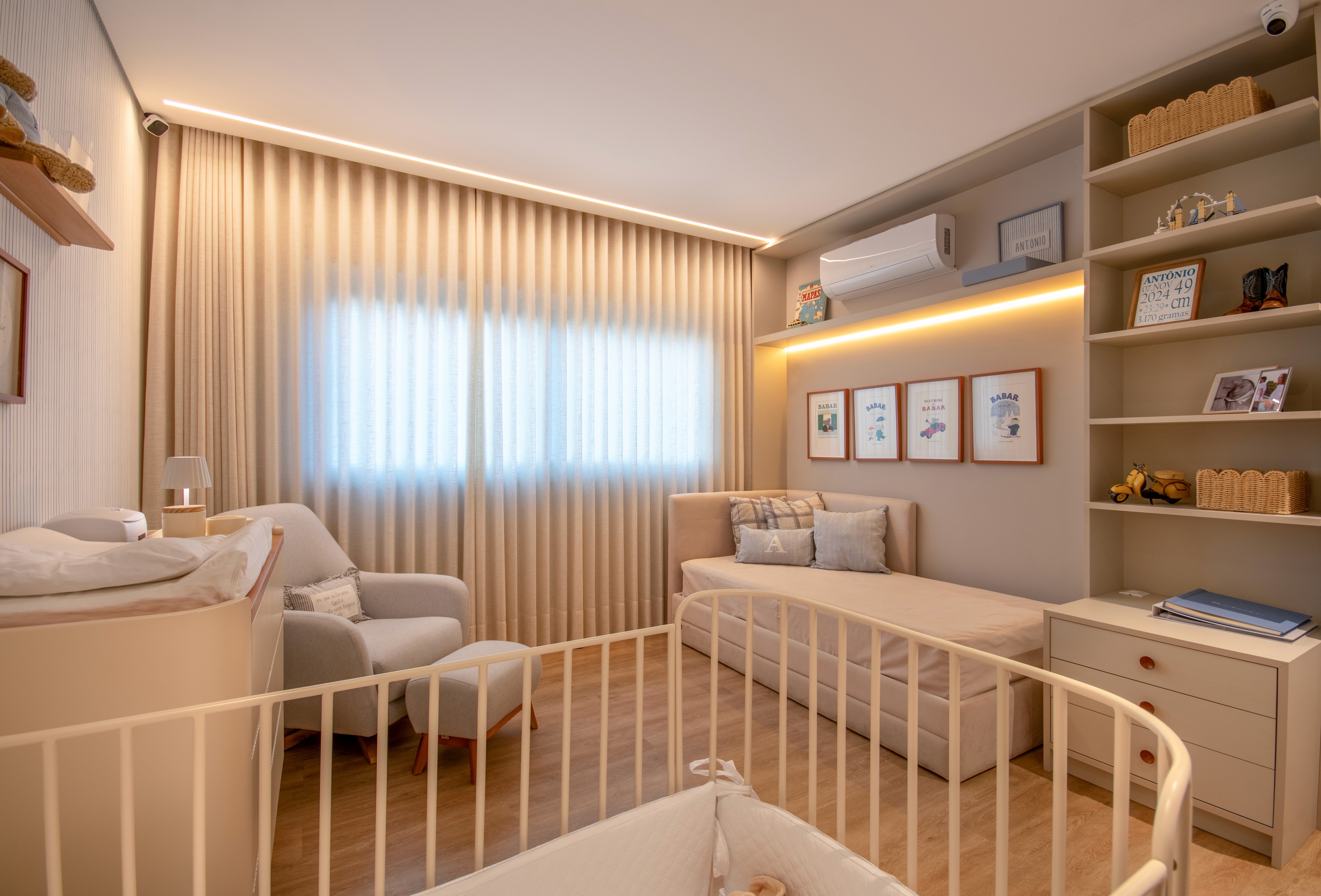 A cohesive kitchen and dinning area, and a baby's room in an elegant family apartment at Vila da Serra, Belo Horizonte, Brazil.