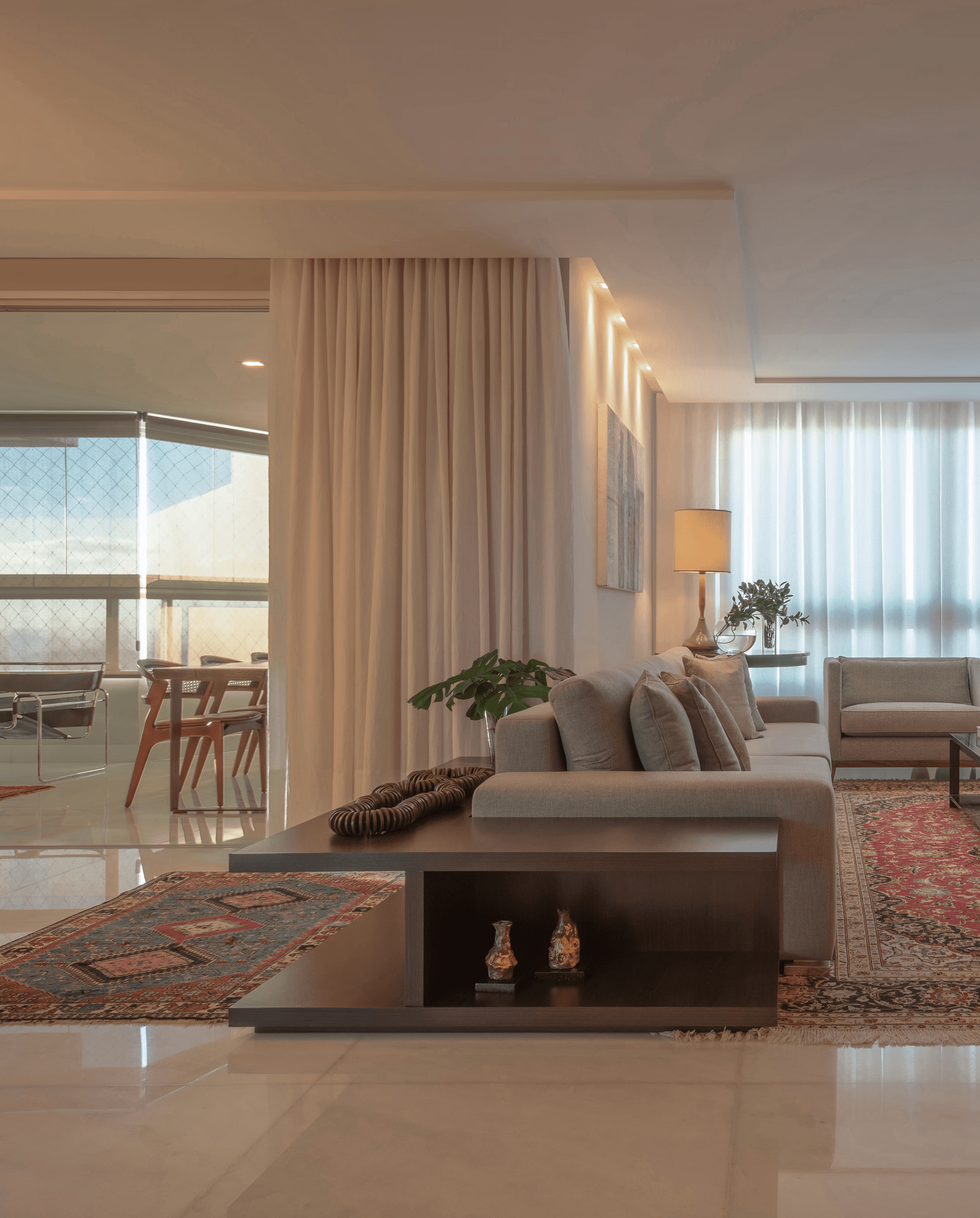 Leisure area consisting of integrated media room, dining room and outdoors barbecue and sitting area on a high-end residential project at Belvedere, Belo Horizonte, Brazil.