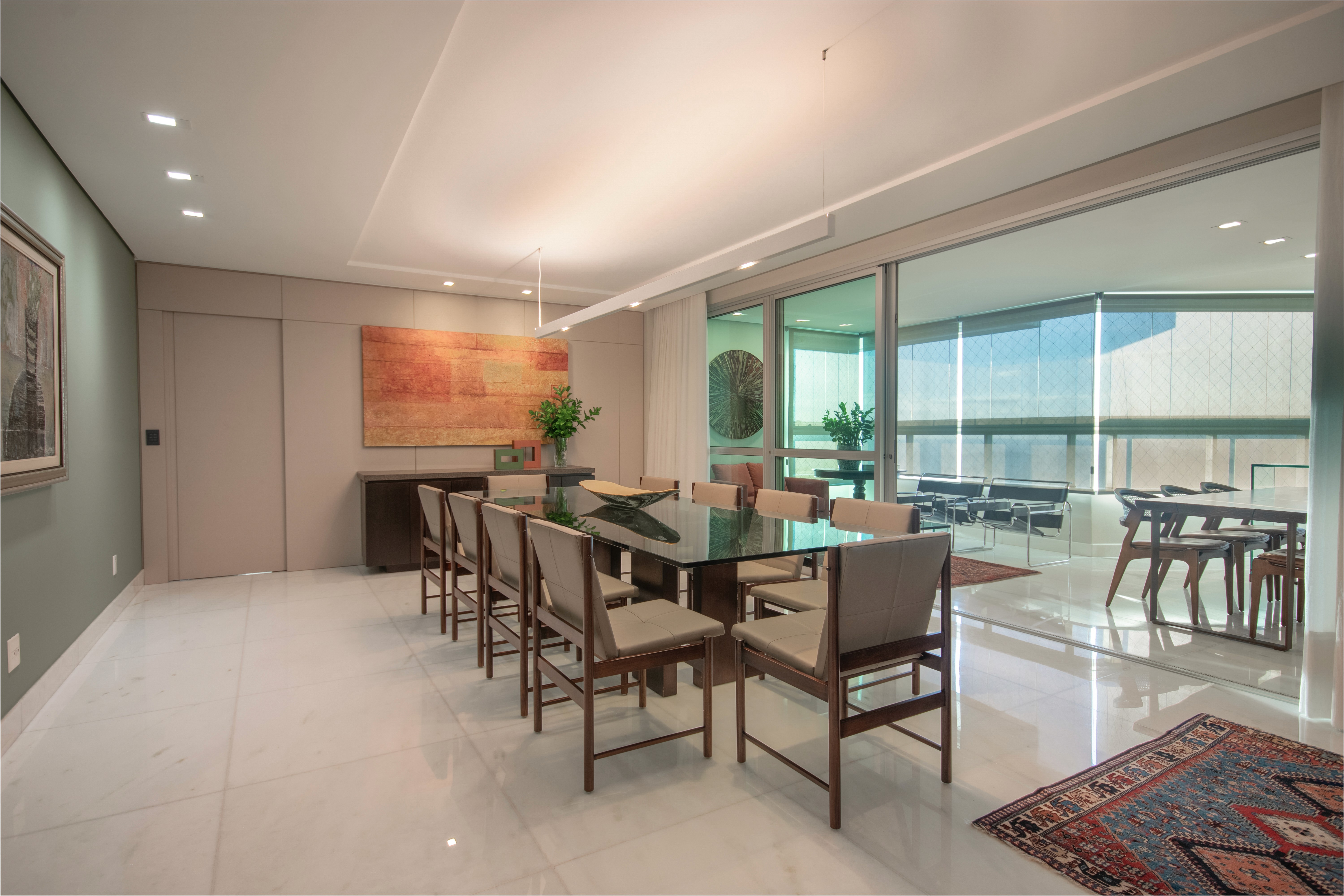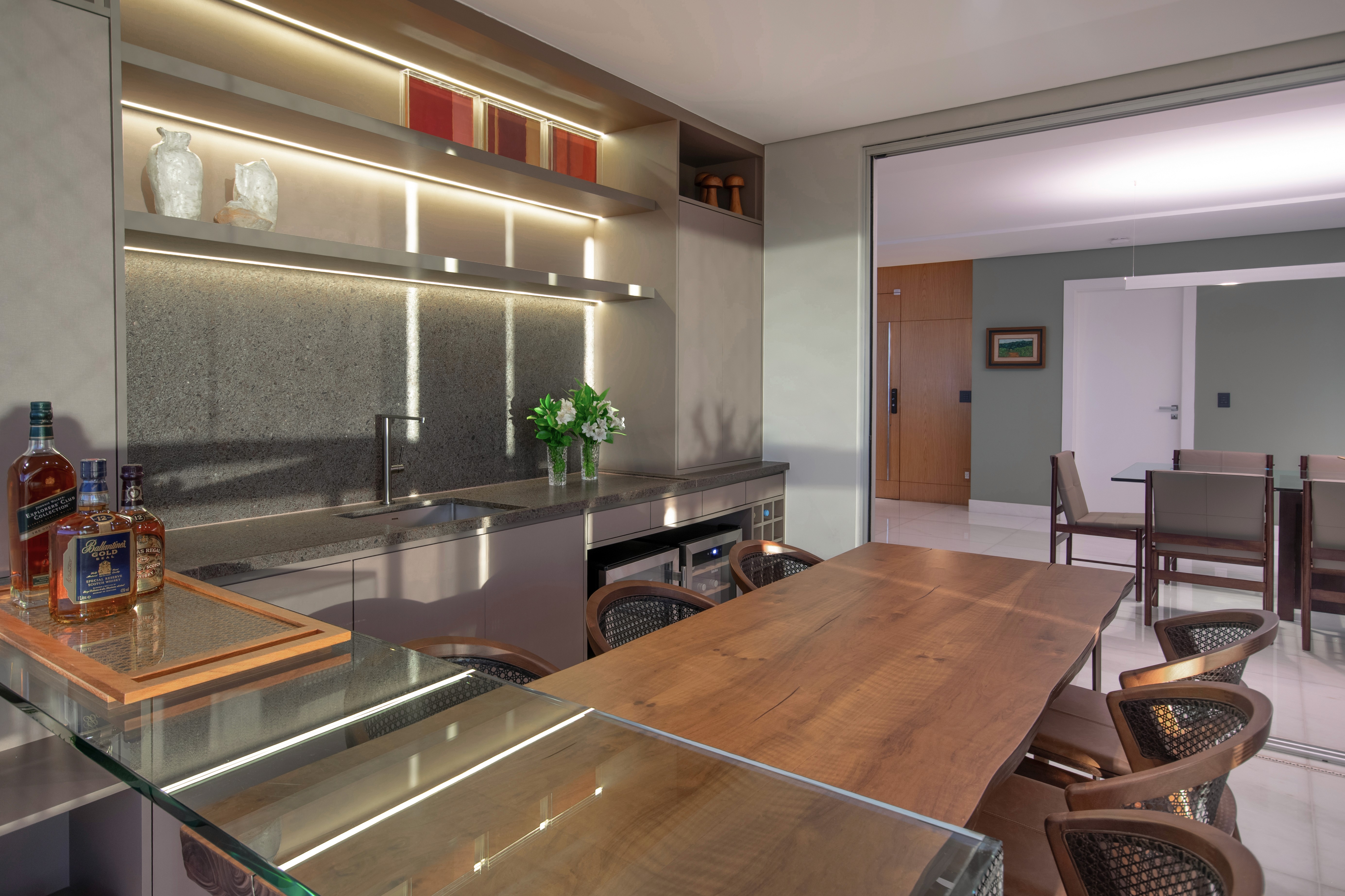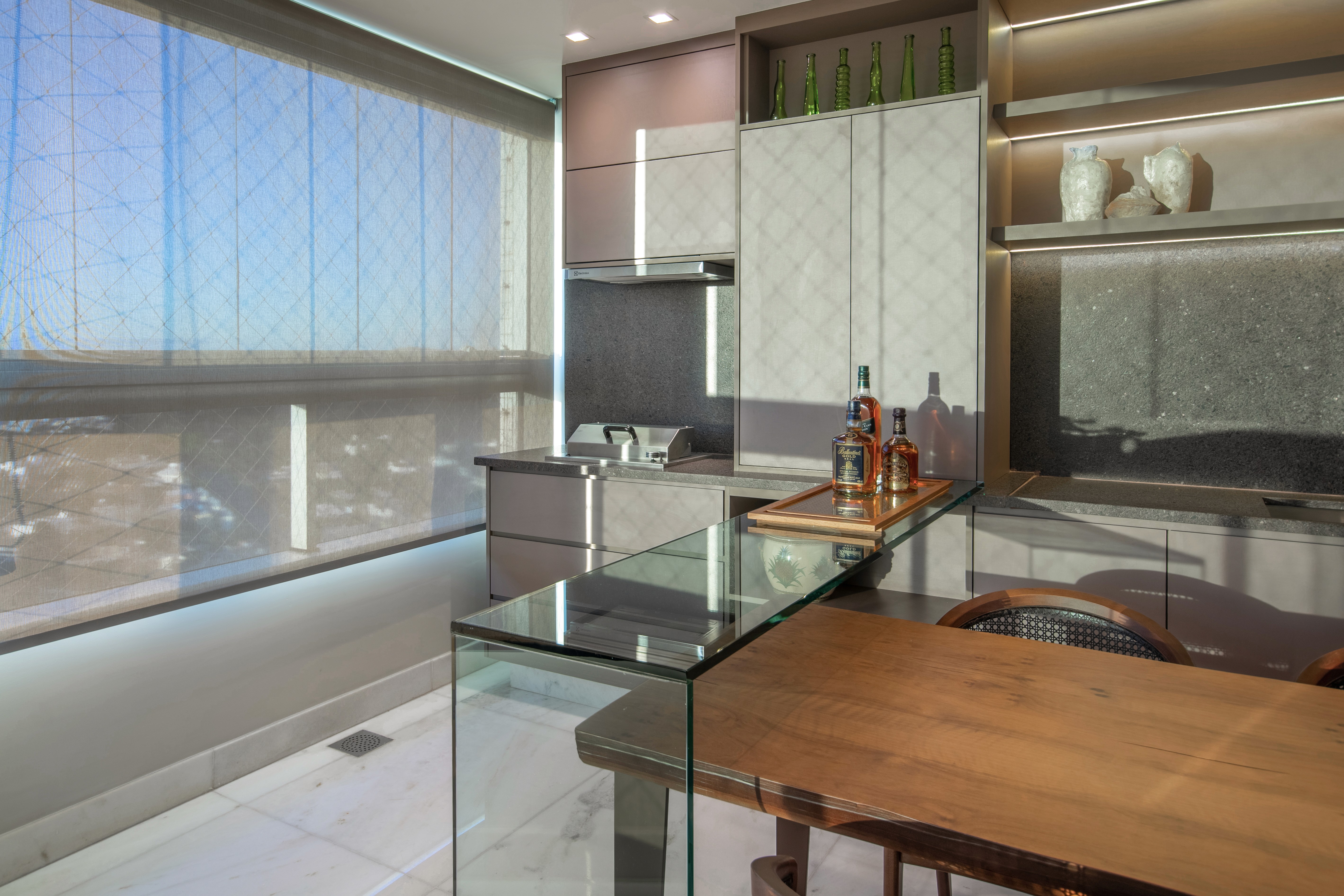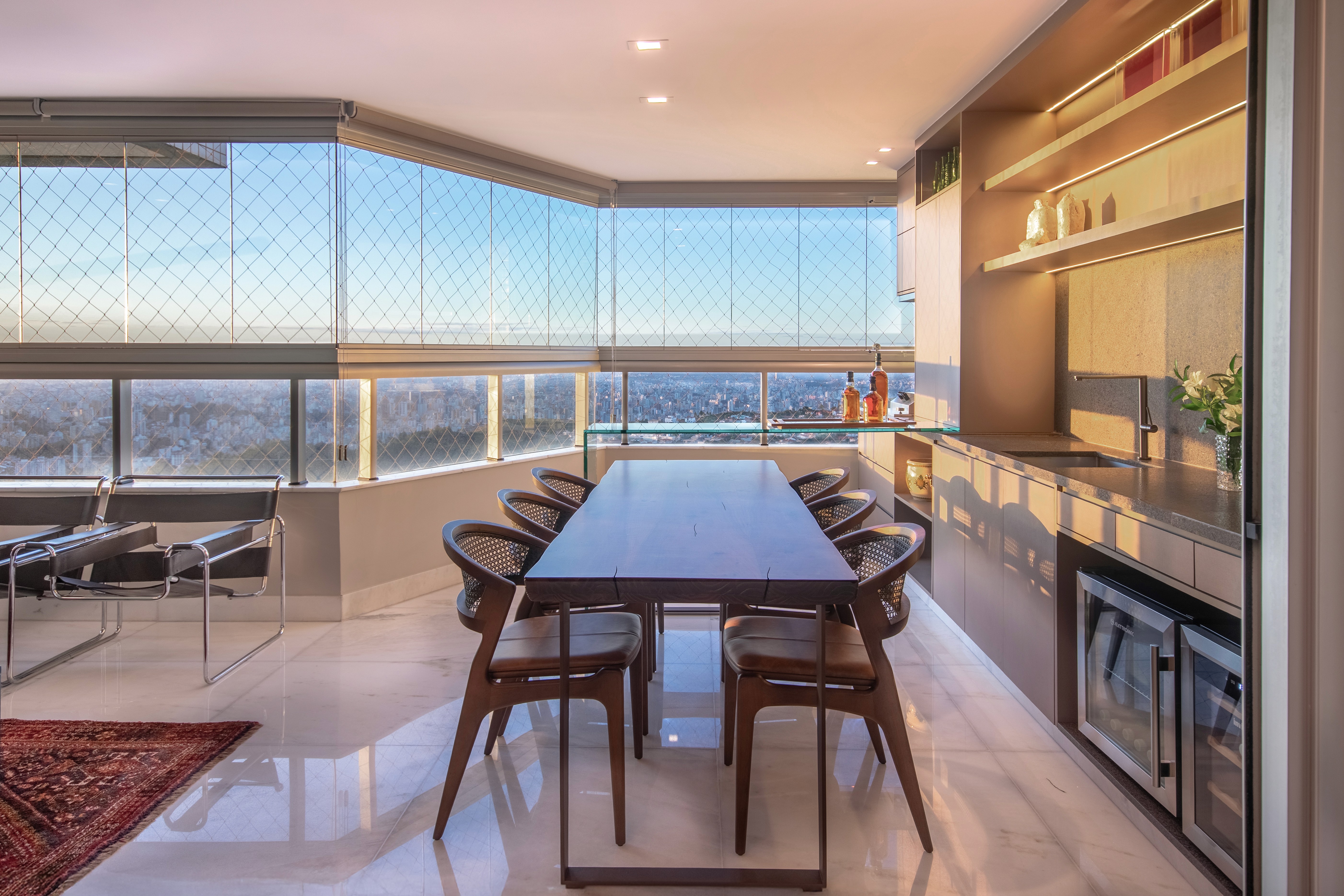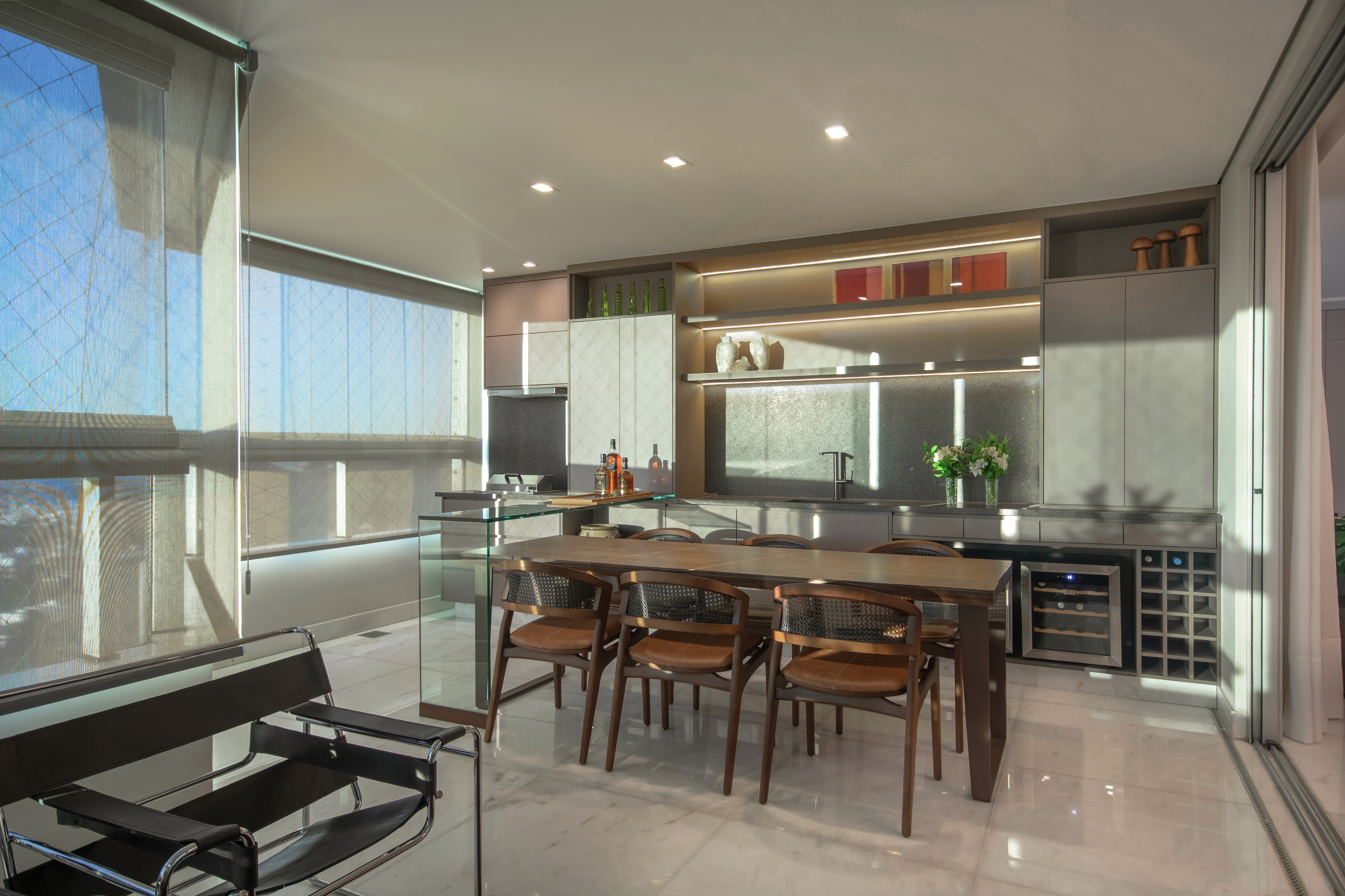 Leisure area consisting of integrated media room, dining room and outdoors barbecue and sitting area on a high-end residential project at Belvedere, Belo Horizonte, Brazil.