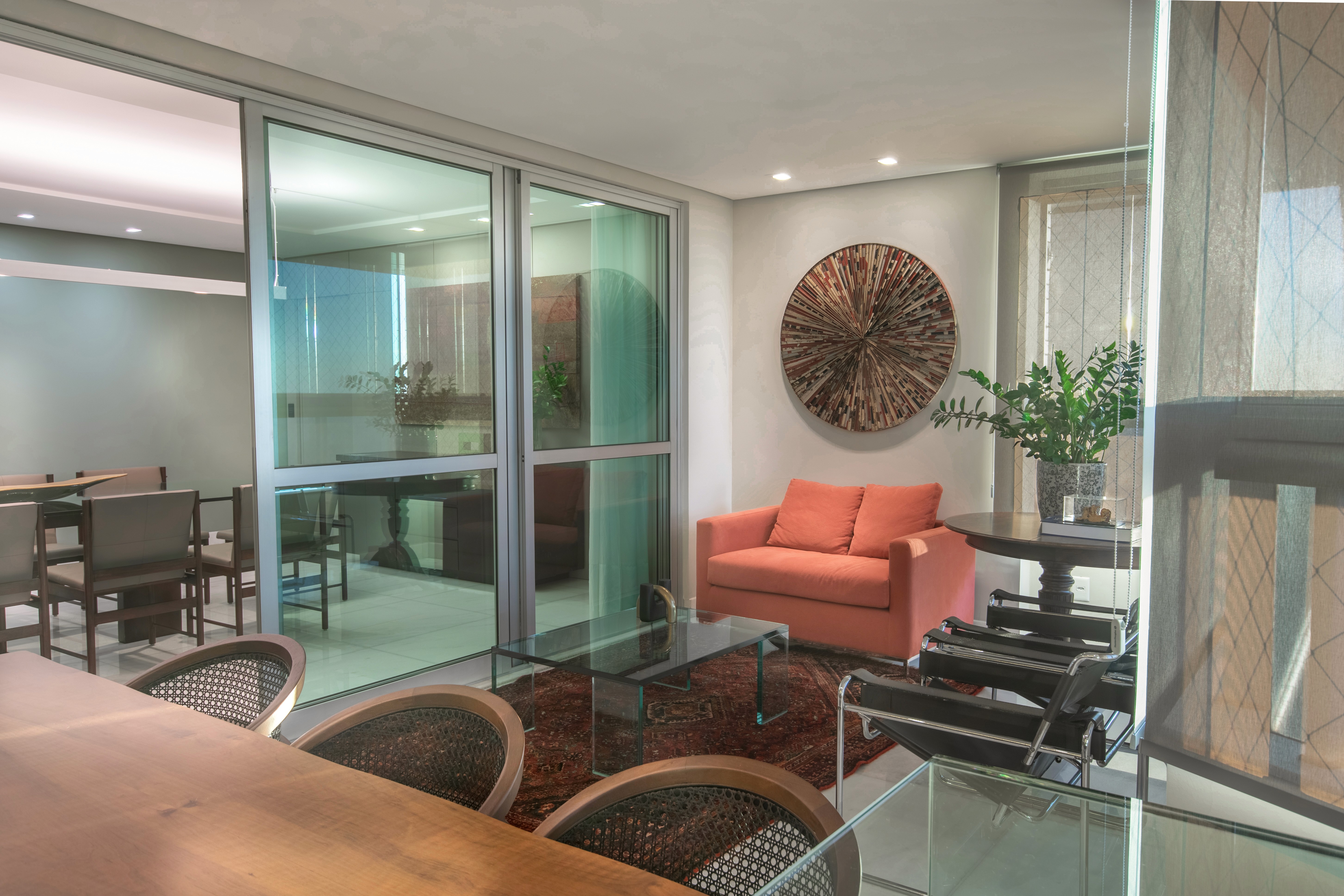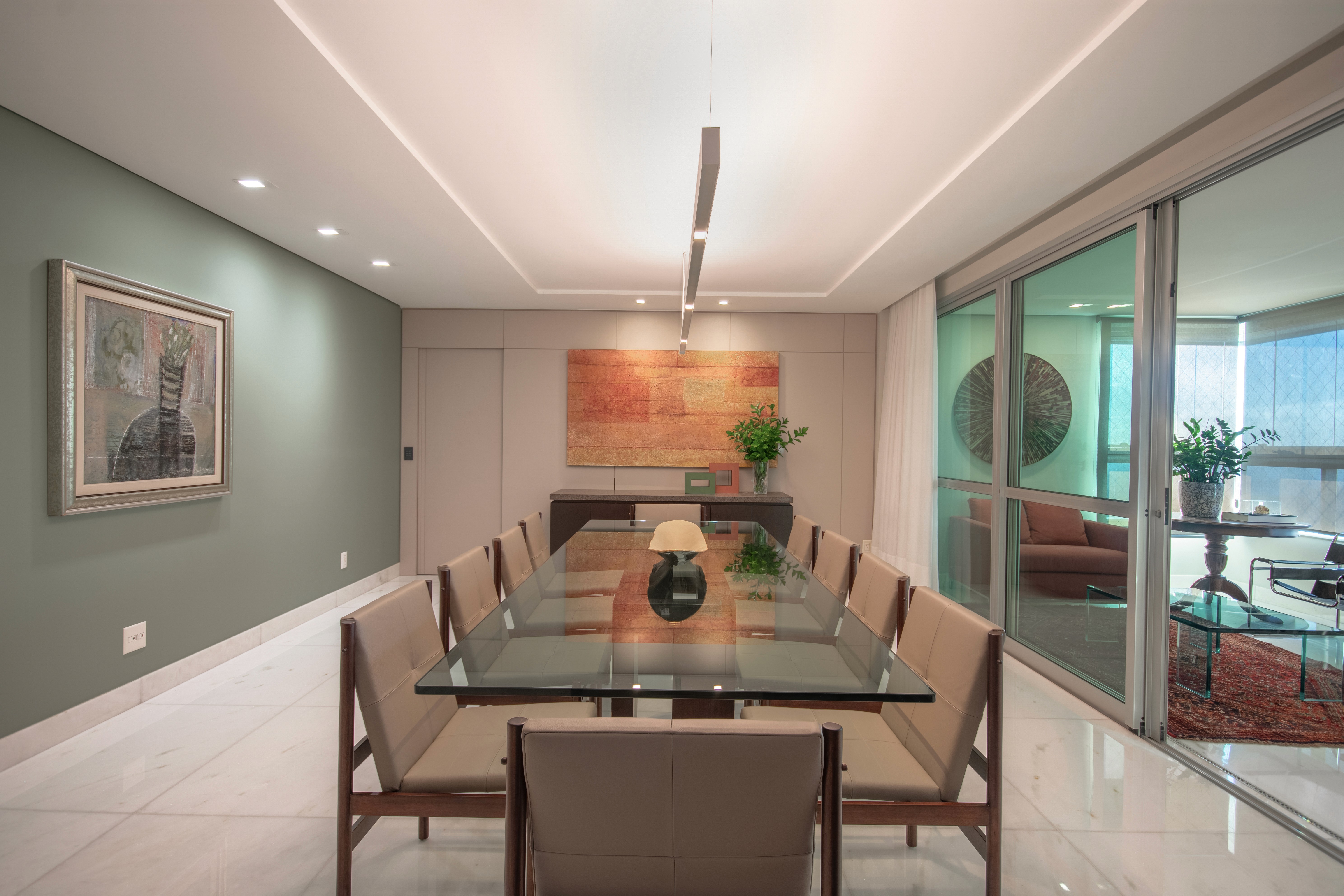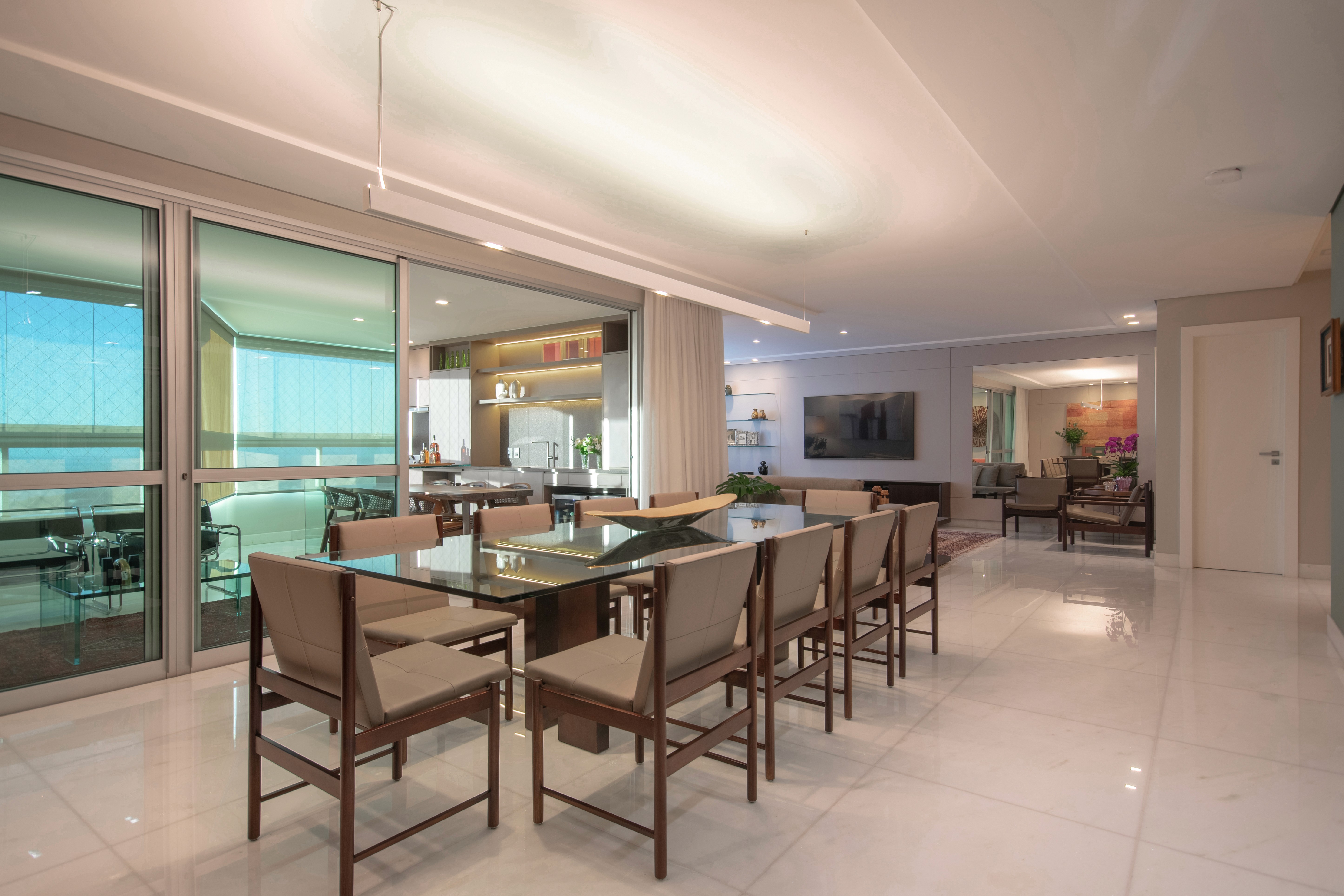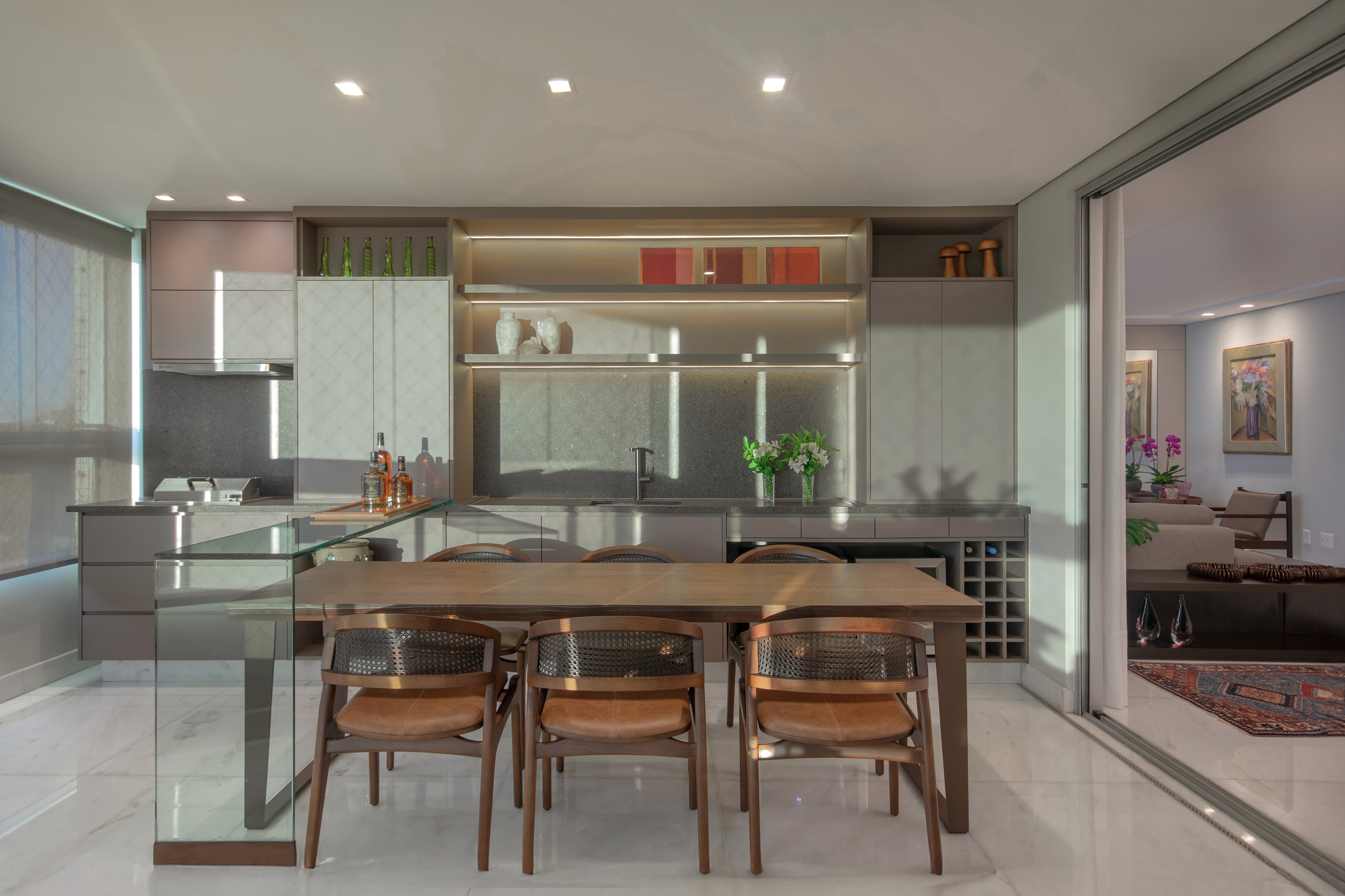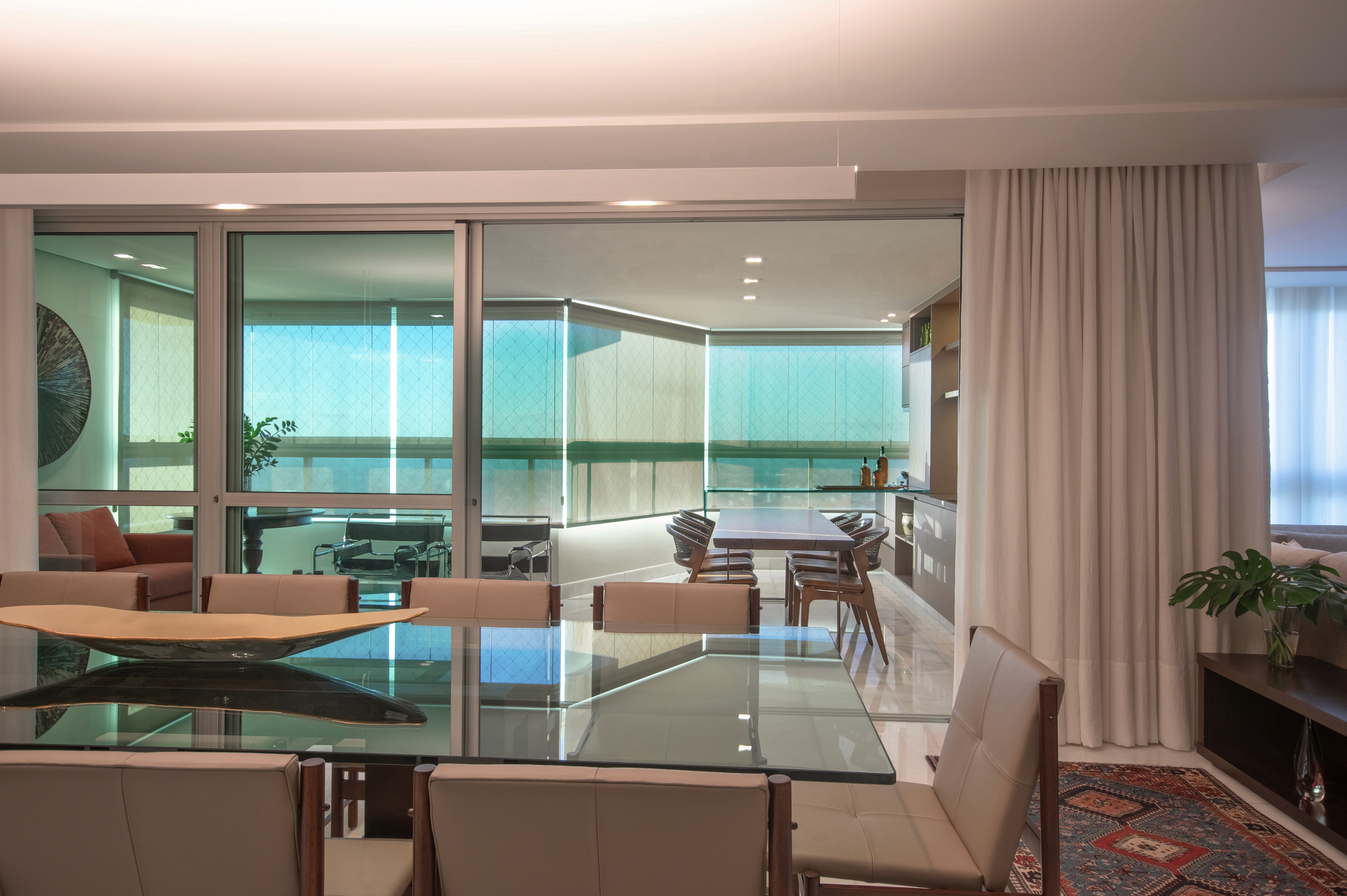 Leisure area consisting of integrated media room, dining room and outdoors barbecue and sitting area on a high-end residential project at Belvedere, Belo Horizonte, Brazil.