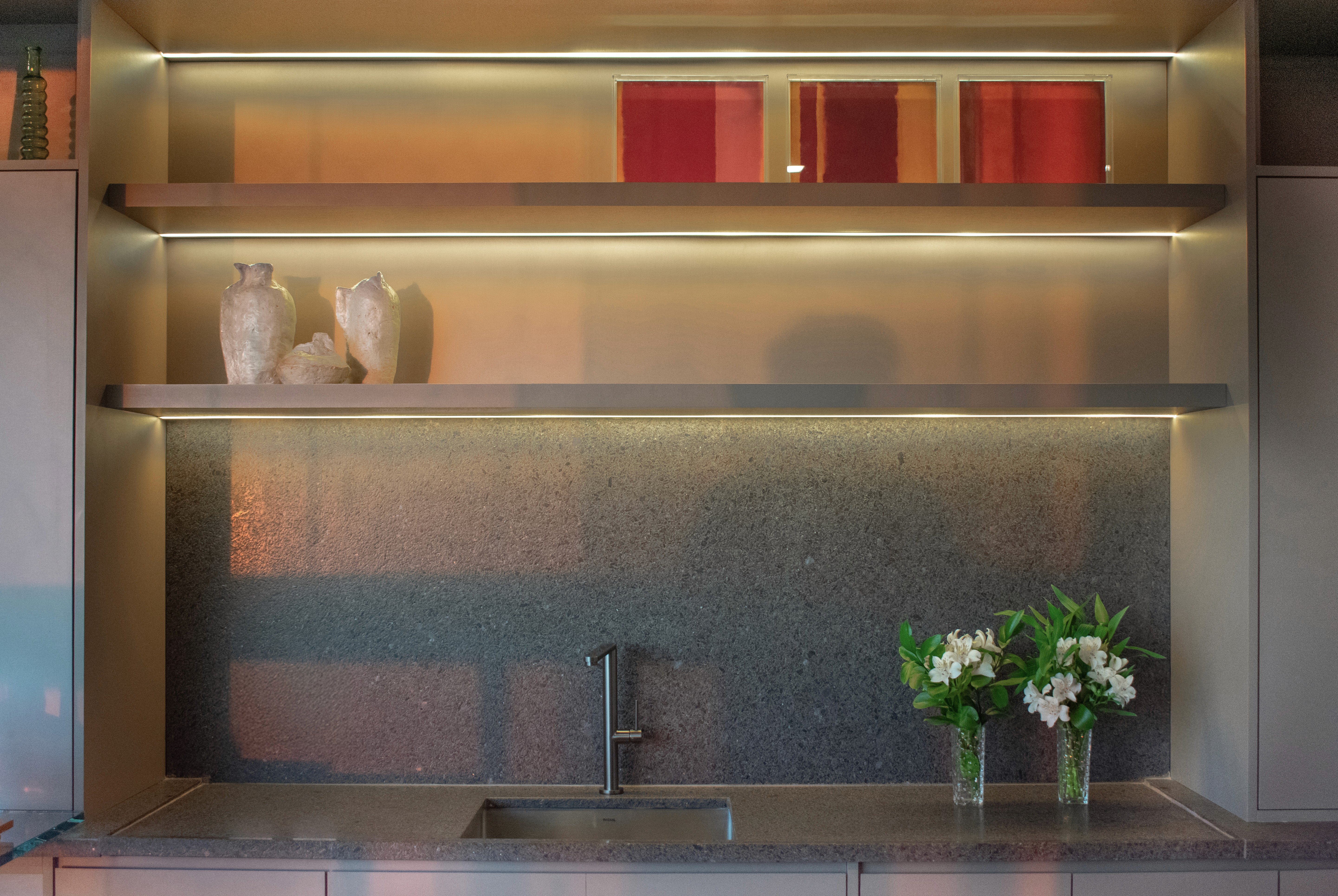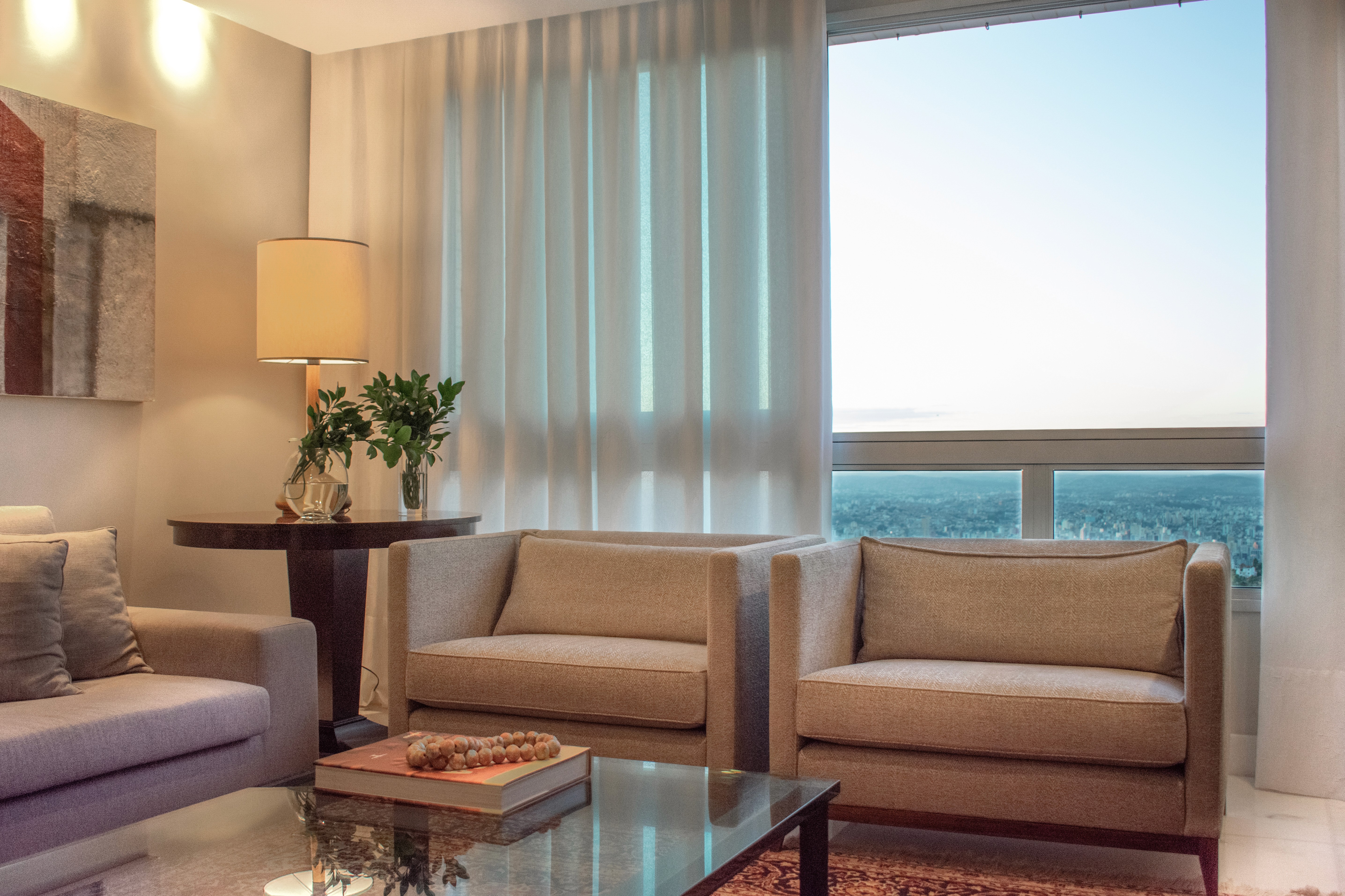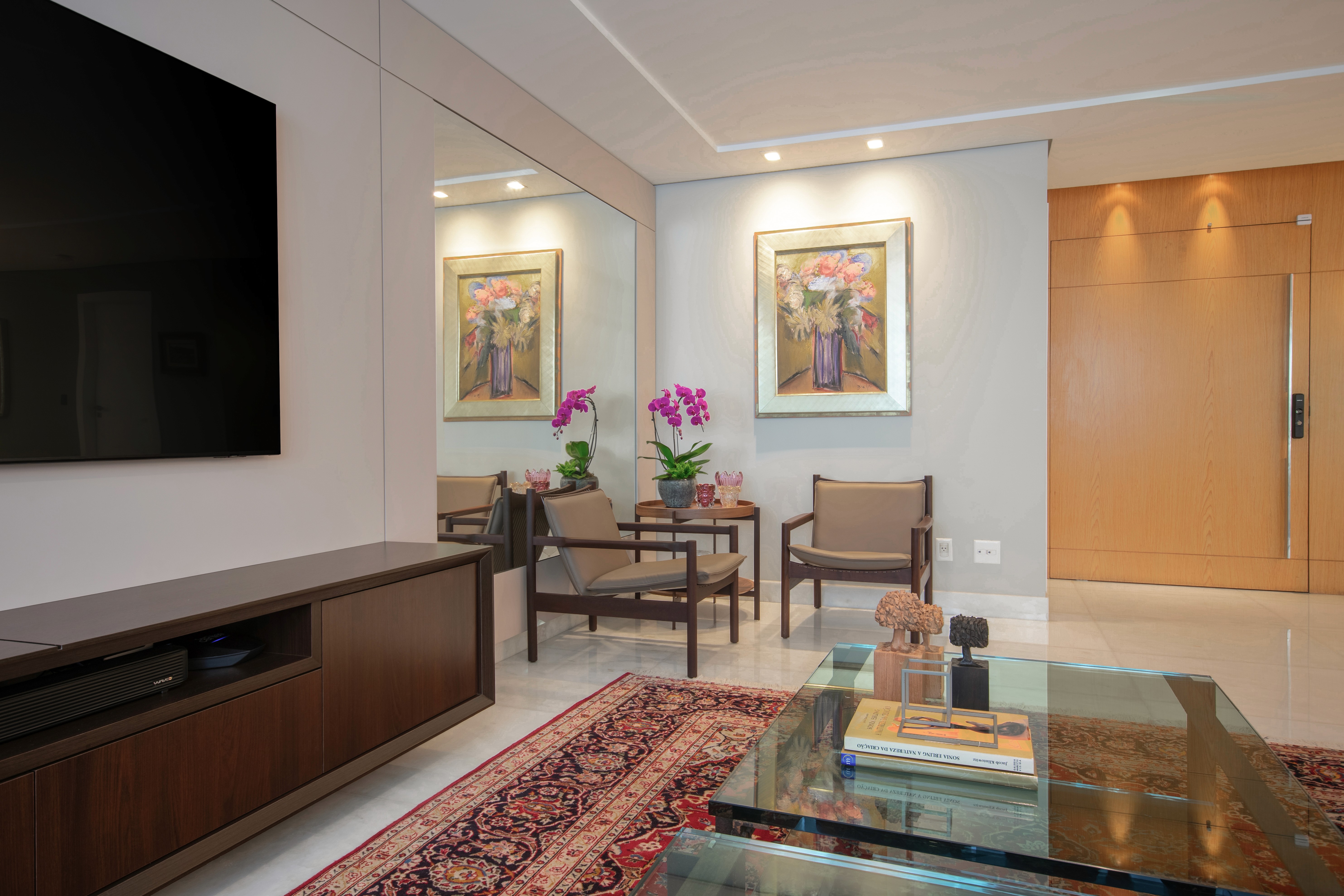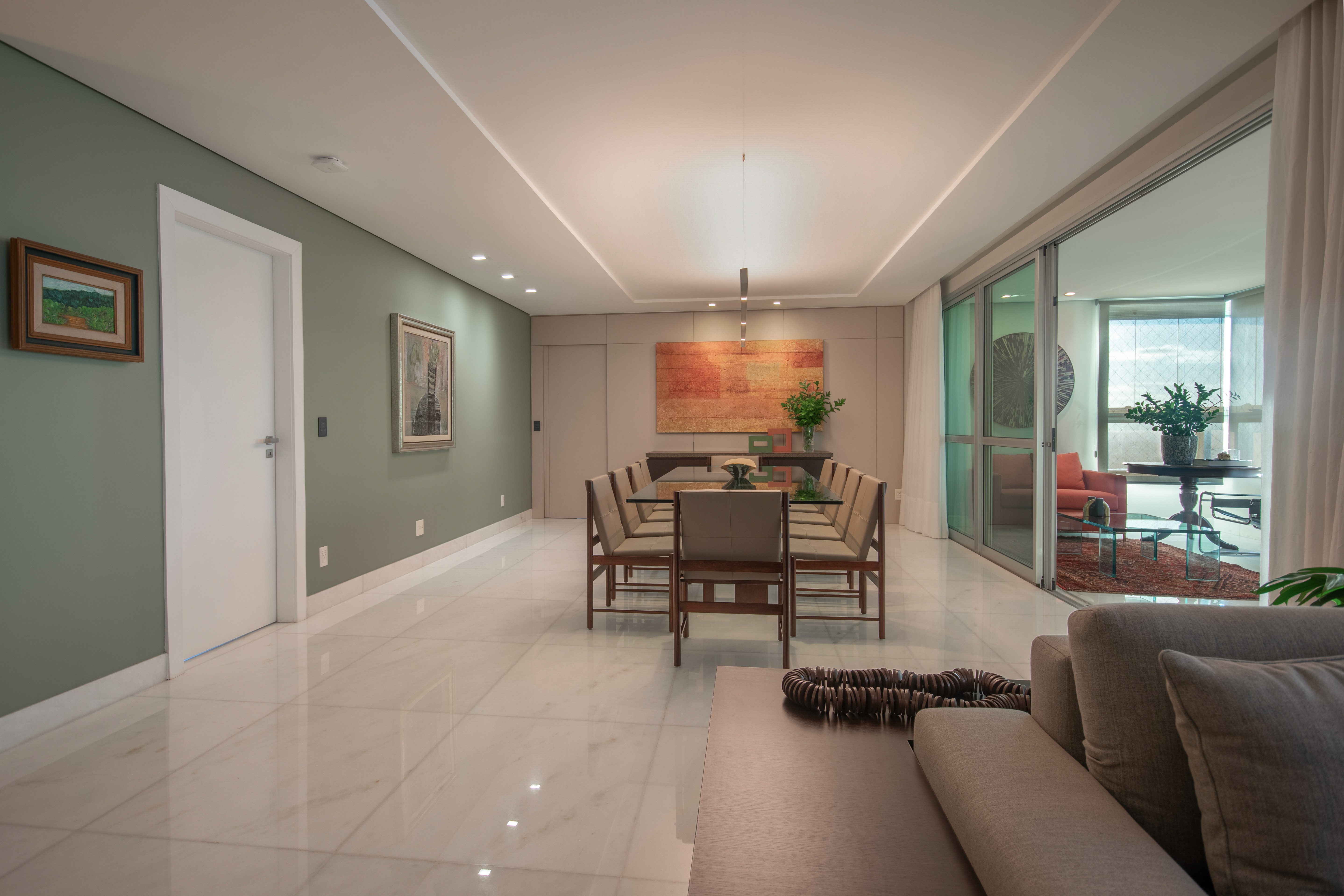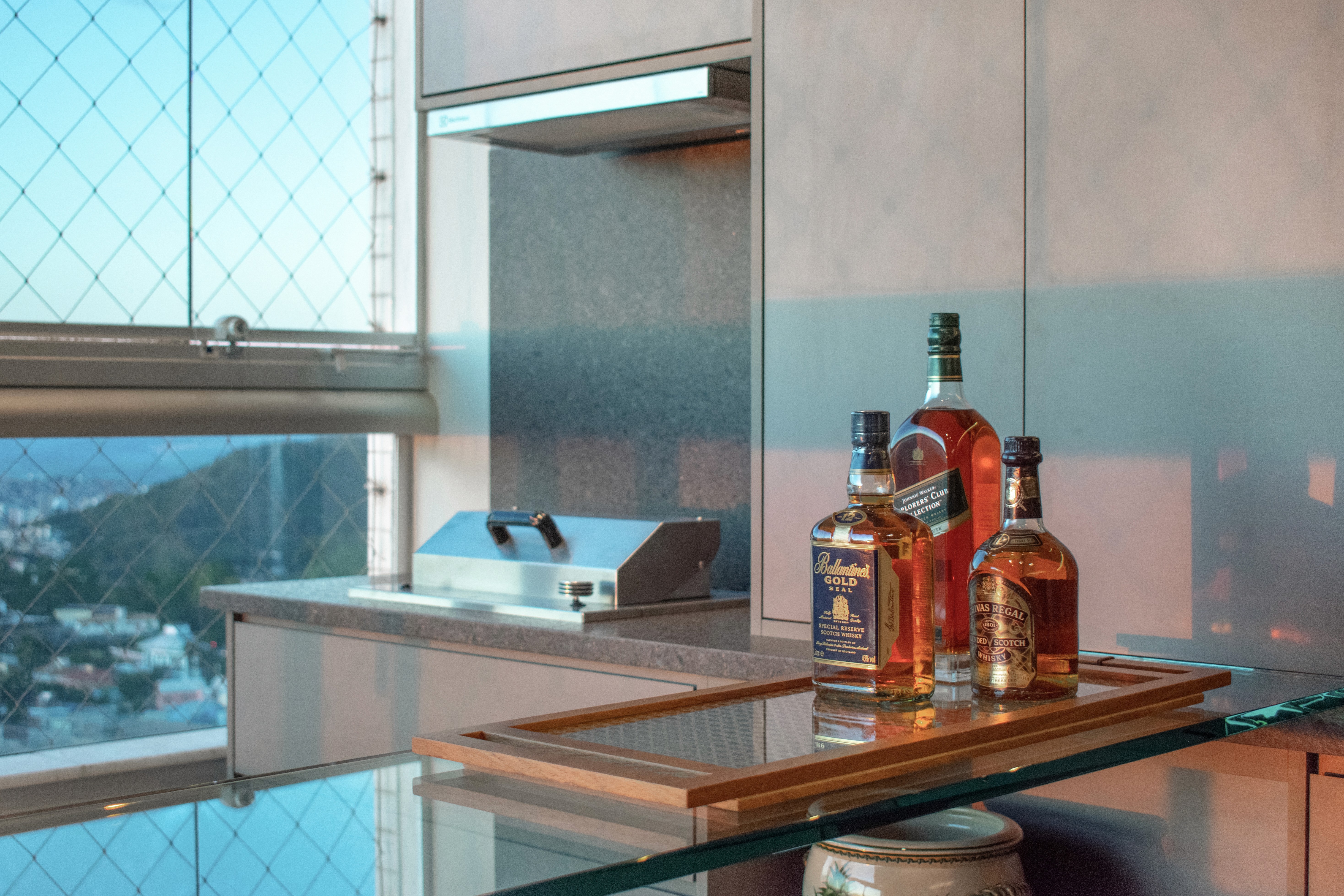 Leisure area consisting of integrated media room, dining room and outdoors barbecue and sitting area on a high-end residential project at Belvedere, Belo Horizonte, Brazil.